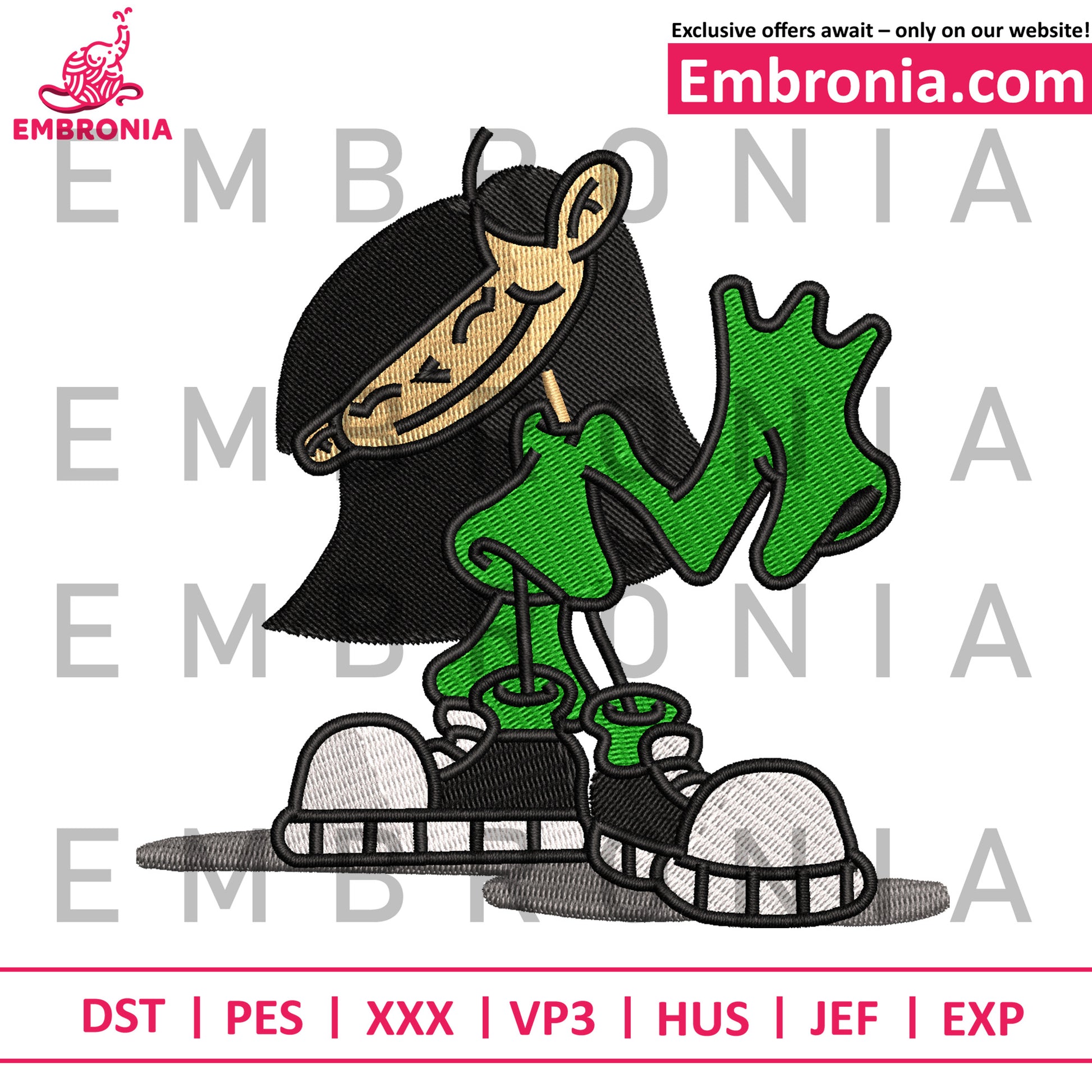 This is a digital Girl char embroidery design of a cartoon girl character with long black hair, a pale yellow face, and a sly smile. She is wearing a bright green top with matching gloves and oversized sneakers. The design's style resembles an anime or manga character. The bottom lists different embroidery file formats.