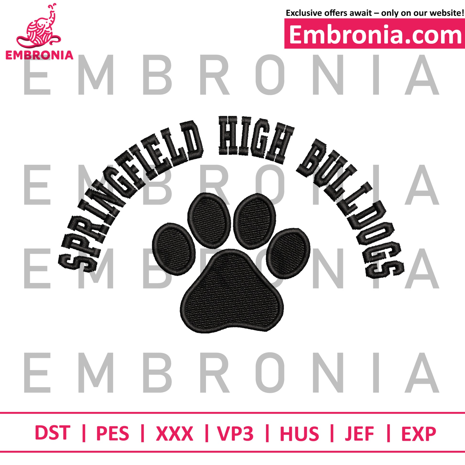 This classic school spirit Springfield embroidery design features a prominent paw print logo. Arched varsity-style lettering spells out "Springfield High Bulldogs" above the central symbol. Rendered entirely in black stitching, this clean and bold embroidery pattern is a perfect way to show team pride on apparel and accessories.