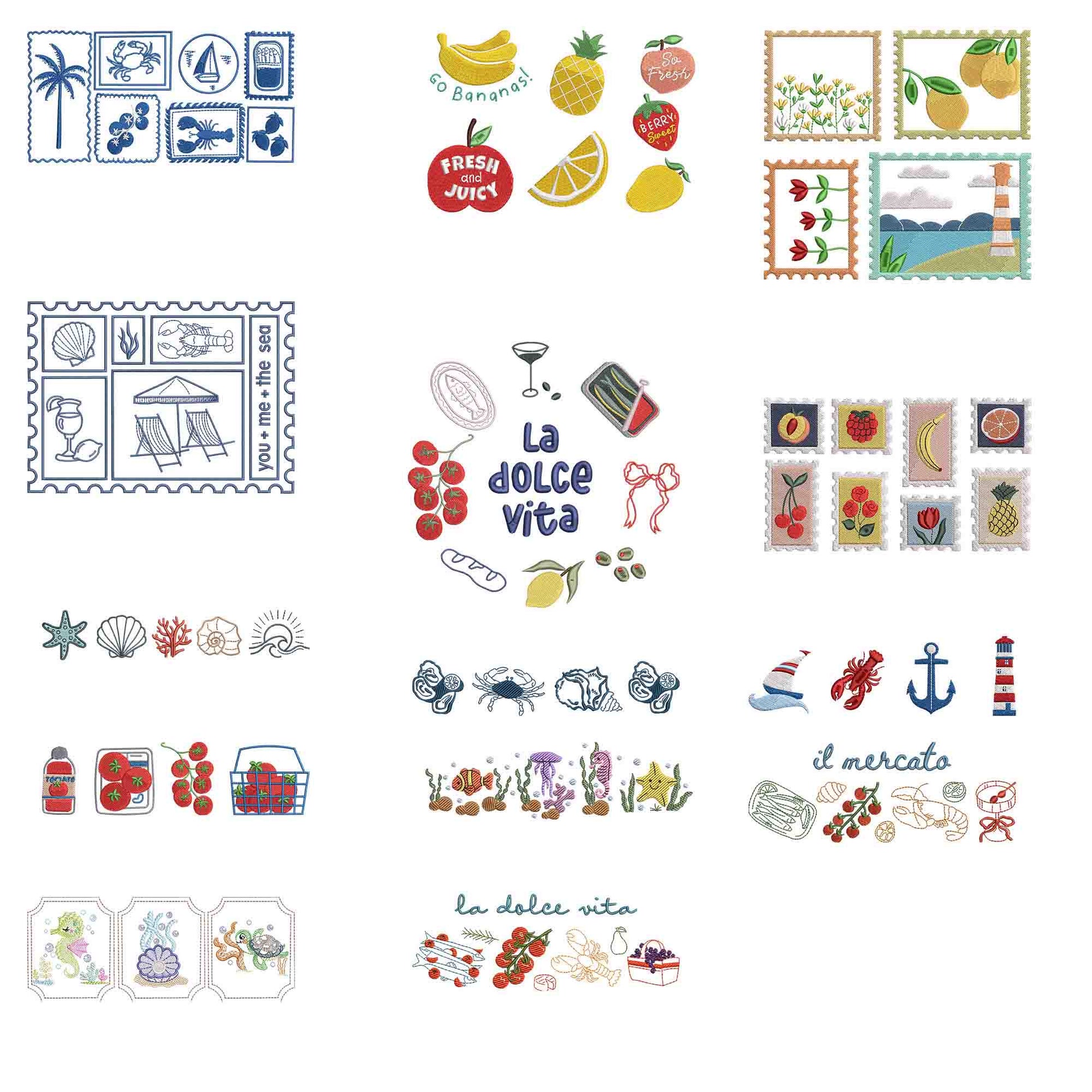 Use these embroidery designs on t-shirts, tote bags, hats, picnic napkins, aprons, beach towels, or market bags to create custom summer pieces full of character and charm.