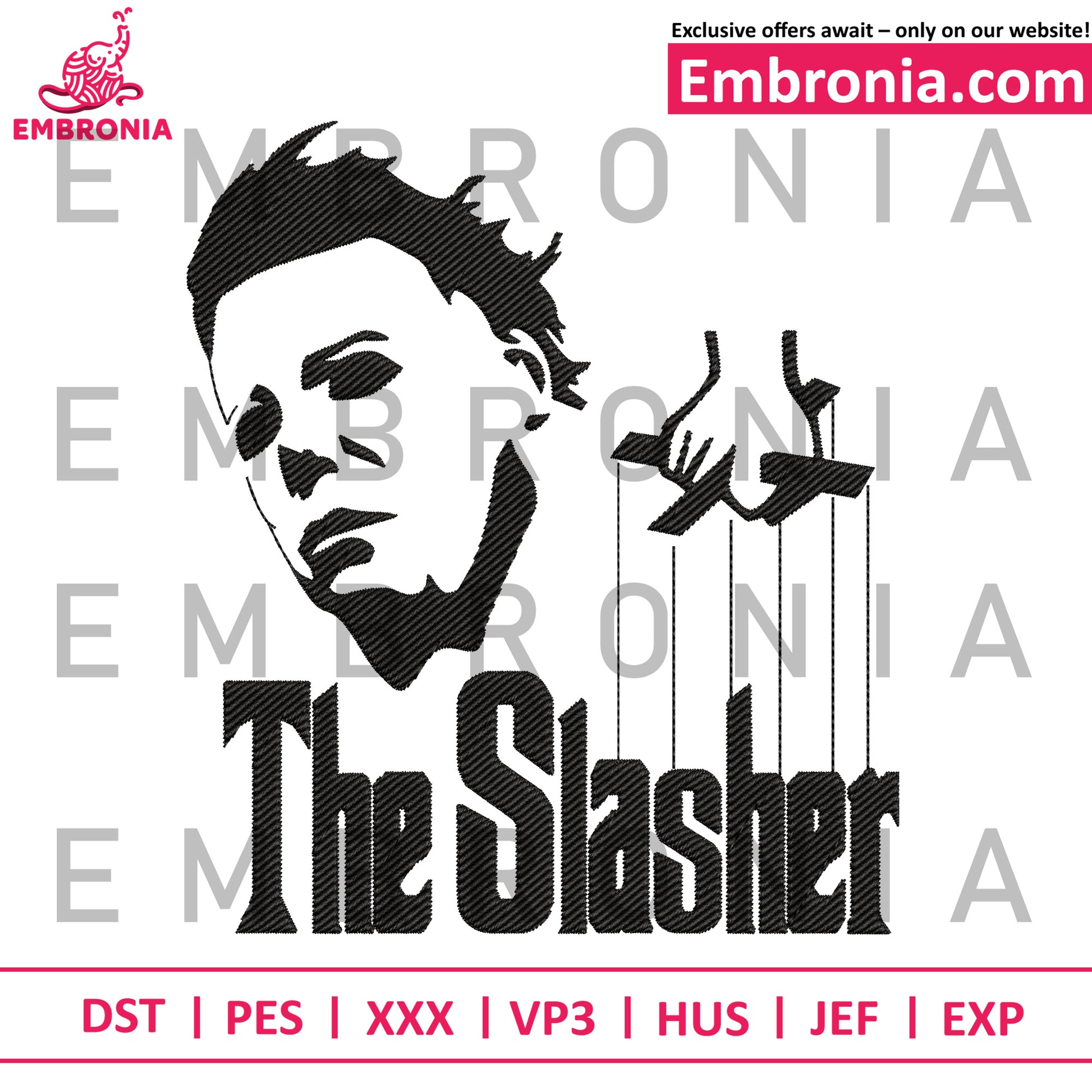 This clever blackwork The slasher embroidery design reimagines horror icon Michael Myers in "The Godfather" style. It features his haunting silhouette and a hand holding a marionette controller over the words "The Slasher," written in the classic film's font. This piece portrays him as the ultimate puppet master of horror.